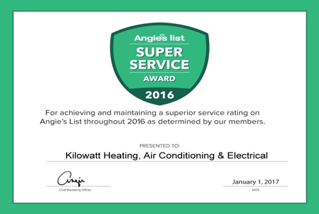 Kilowatt Heating, Air Conditioning & Electrical has earned the home service industry’s coveted Angie’s List Super Service Award, reflecting an exemplary year of customer service to members of the local services marketplace and consumer review site in 2016.
